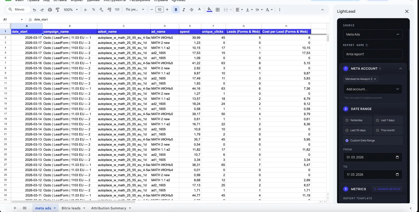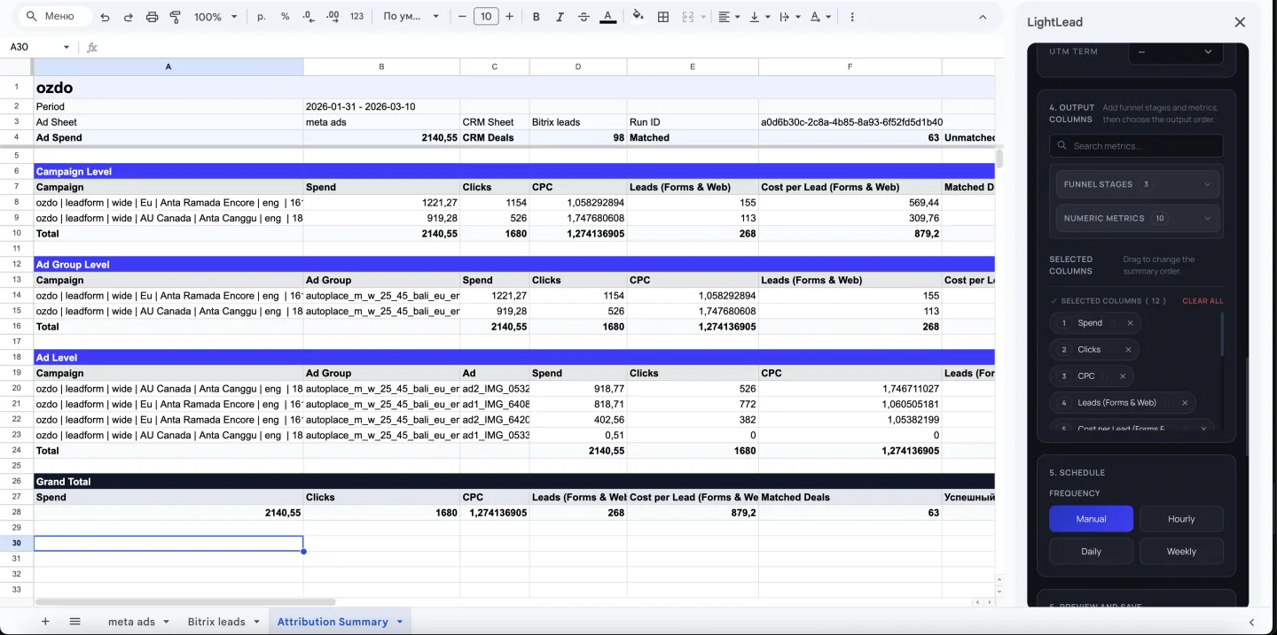 Рост CPL, просадка лидов, лучшая кампания недели, расхождения между рекламой и CRM, рекомендации что проверить в первую очередь.